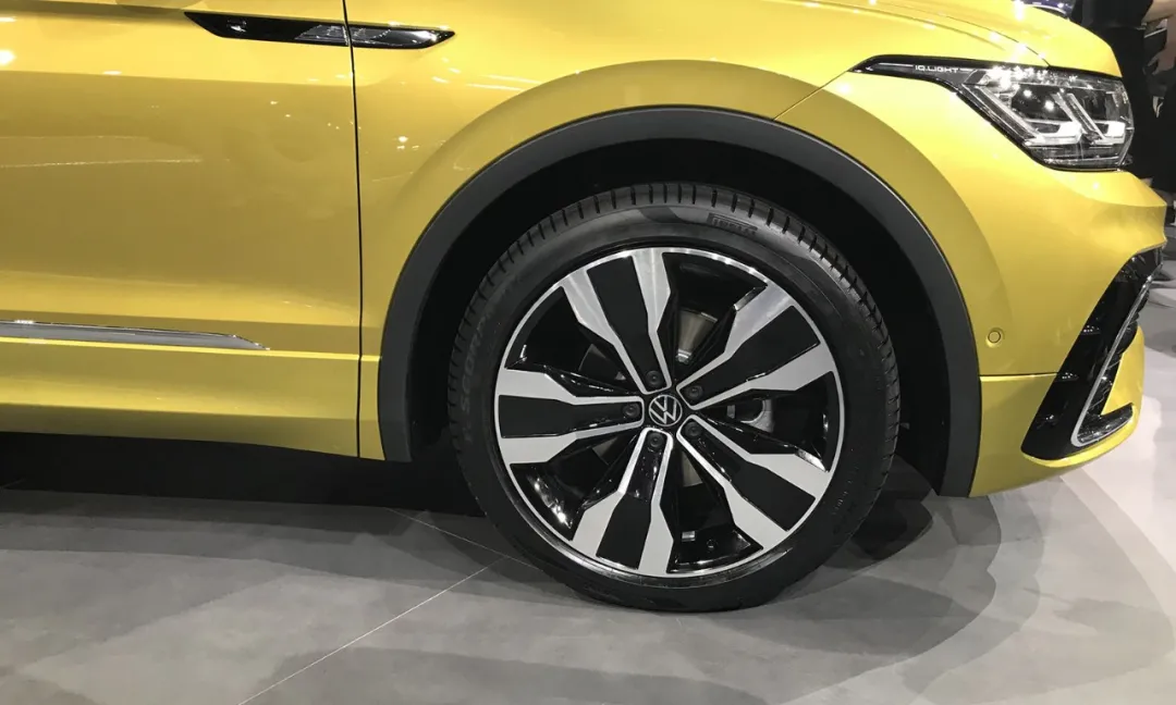 轮圈方面,新车配备有20英寸双色轮圈,实拍车型的轮胎的尺寸为235/45 R20。大尺寸车轮配合轿跑SUV车身使得途观X的比例感极佳。
